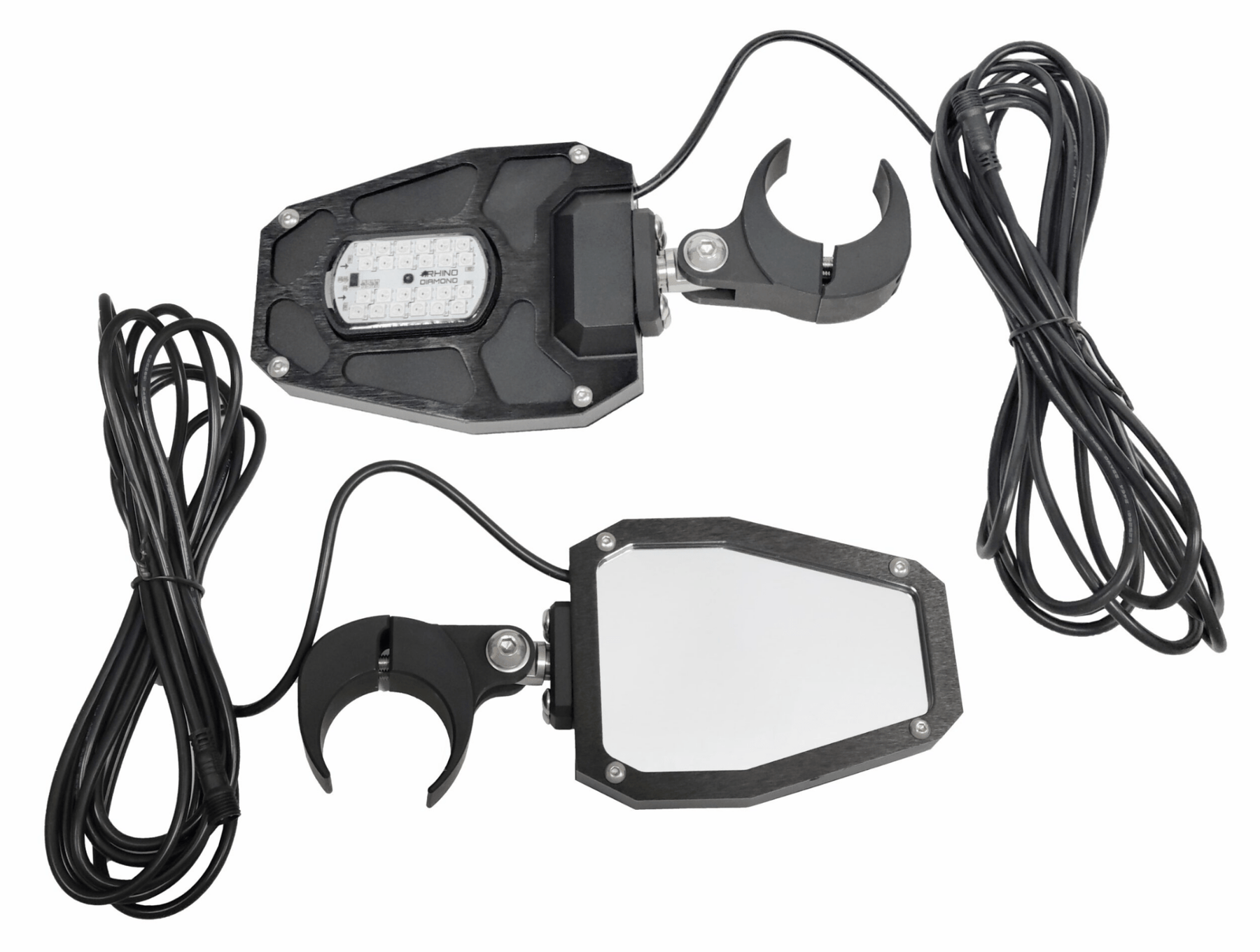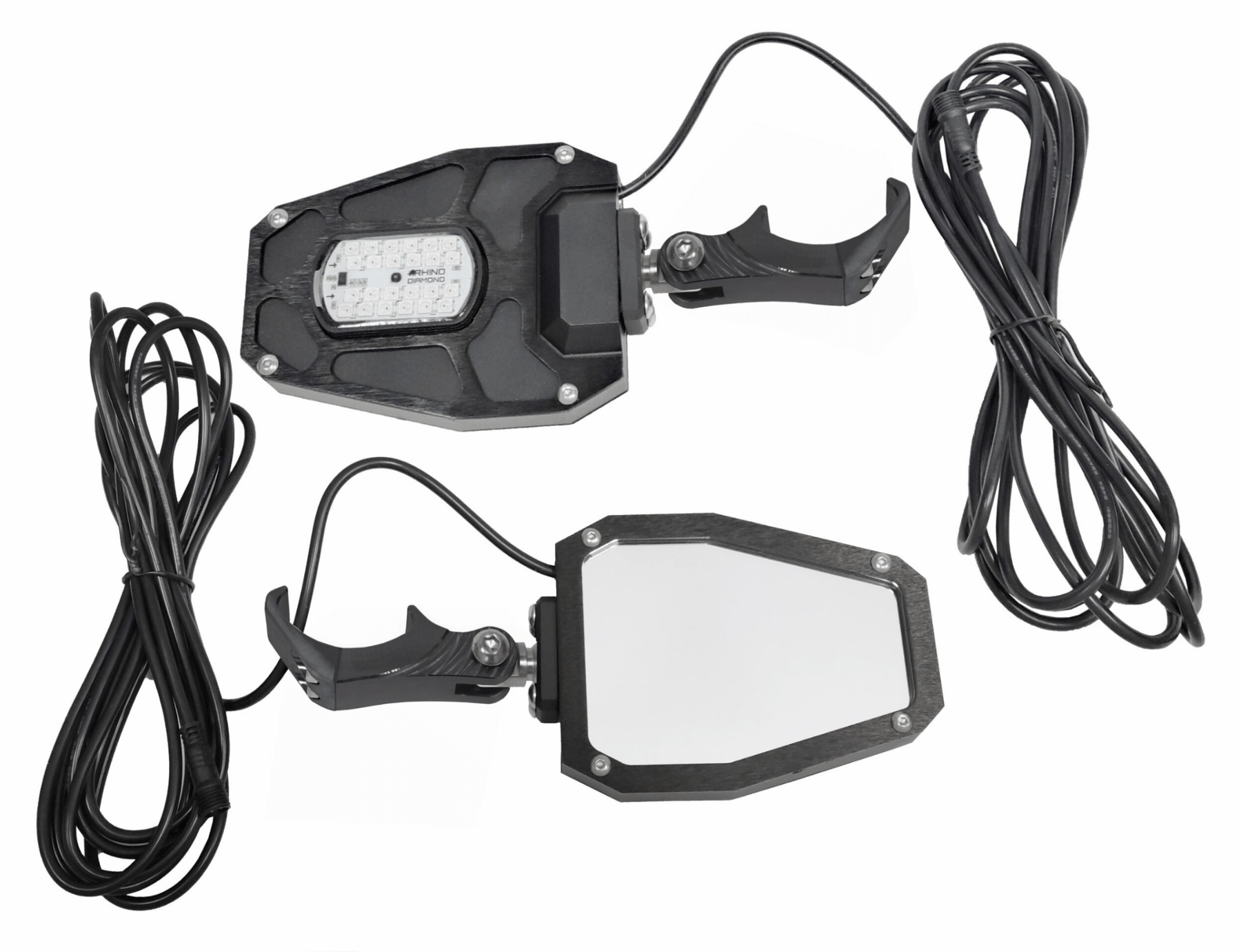 THE DESIGN OF THE MIRRORS WITH THE FULL BREAKAWAY CLAMPS AND THE RHINO LIGHTS POD LIGHT MAKES THIS THE PERFECT CHIOCE FOR ALL TYPES OF RIDING AND TERRAINS.