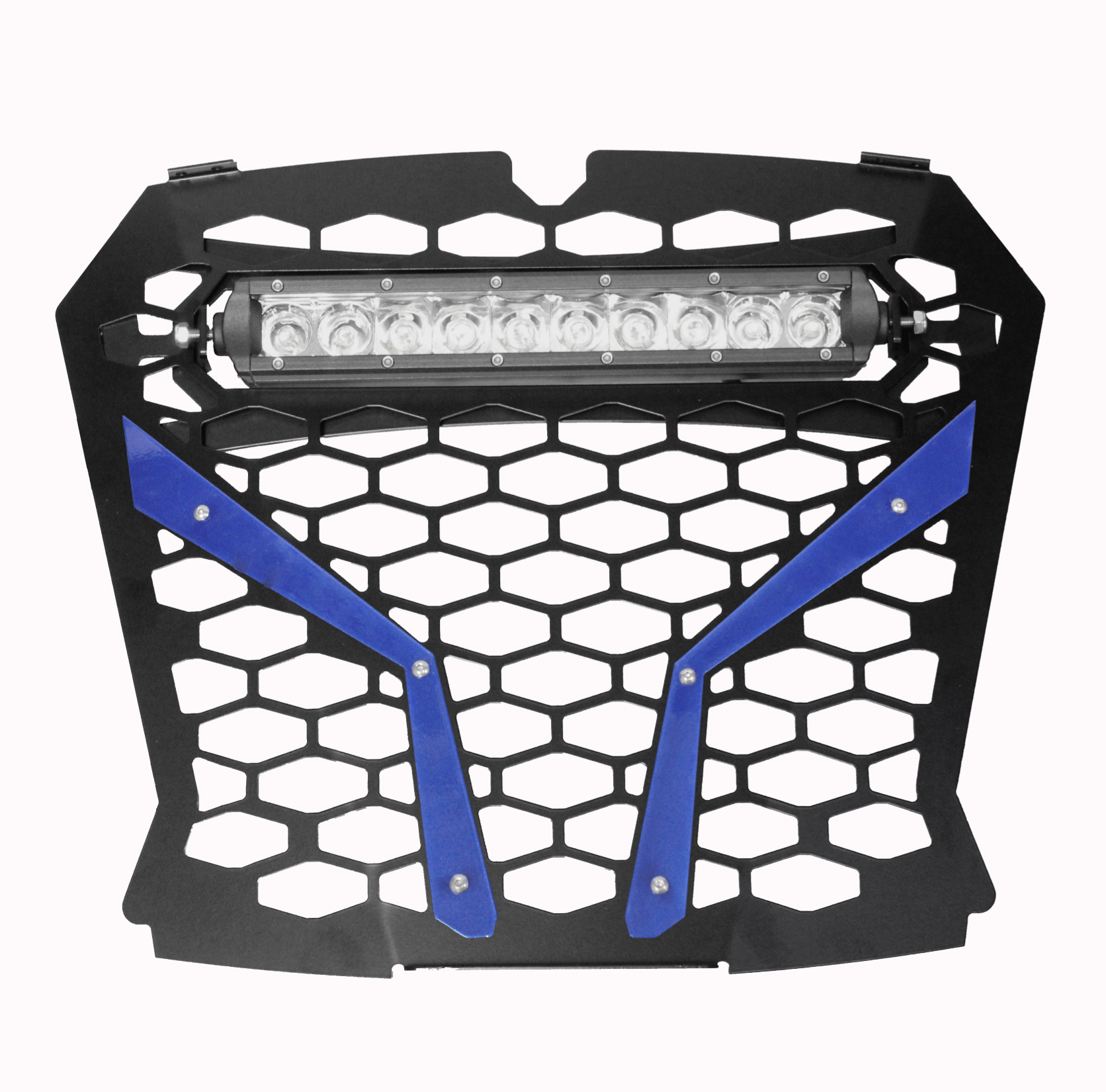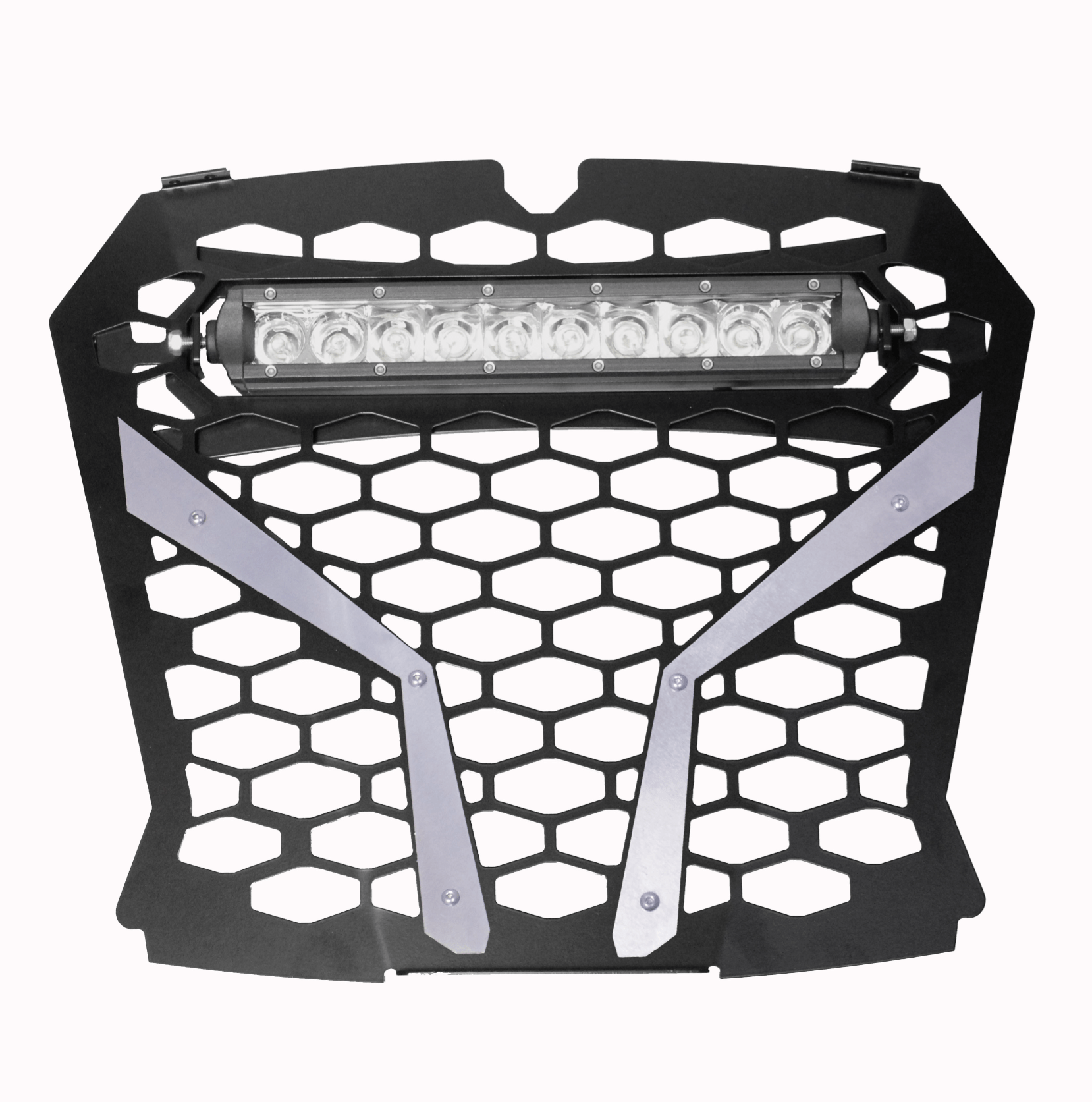 RZR XP Turbo S Front Grill for 10″ Light Bar. Opening for Light Bar is 11 3/8″ Wide x 2″ Tall.  Black Powder Coated with Brushed Aluminum, Red, Blue or Orange Powder Coated Trim. Fits RZR XP Turbo S Models.