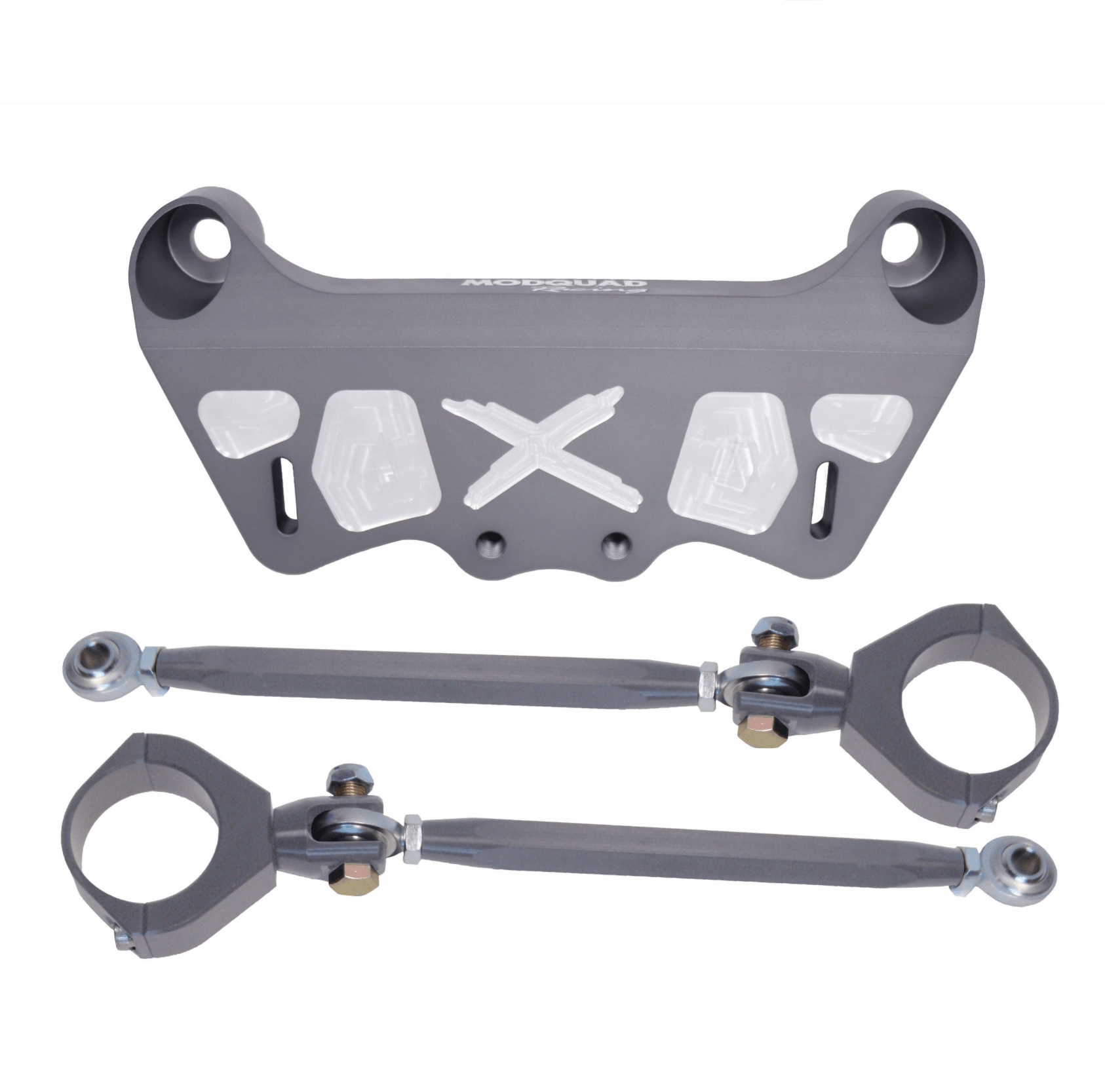 Modquad’s new Can Am X3 front shock tower support provides the added strength and support needed to prevent bending and breakage under extreme load. Our unique design uses a dual tie rod setup that mounts directly to the main frame.
